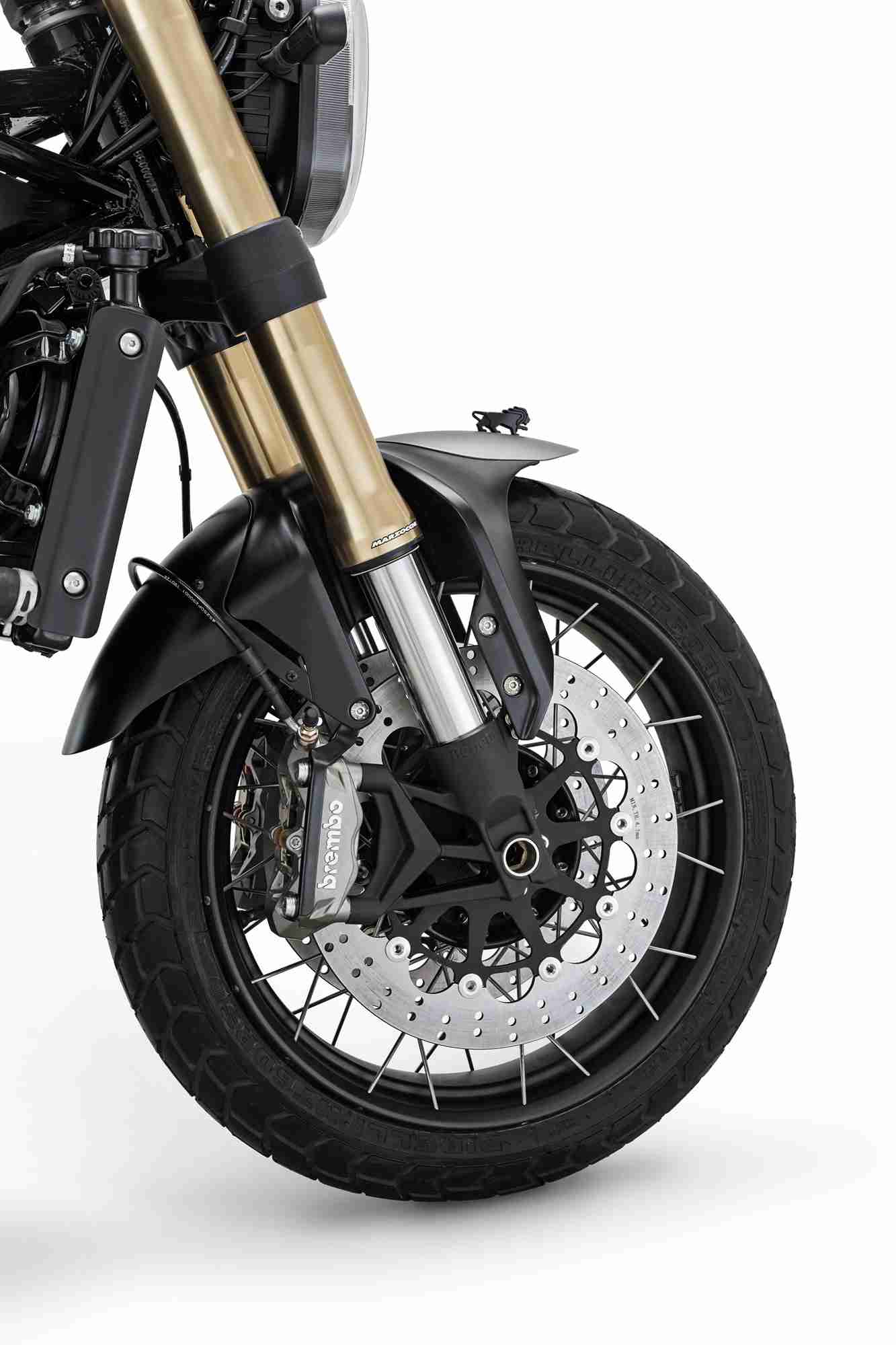 The Brembo braking system comes with a semi-floating double front disc of 320 mm in diameter and a four-piston radial monobloc caliper, while at the rear is a 260 mm diameter disc with a double-piston caliper. The 17 ”spoke wheels in aluminium alloy are fitted with 120 / 70-17 and 180 / 55-17 tubeless tires. The tank has 15 liters of capacity which is the only disproportionate looking element on the bike.