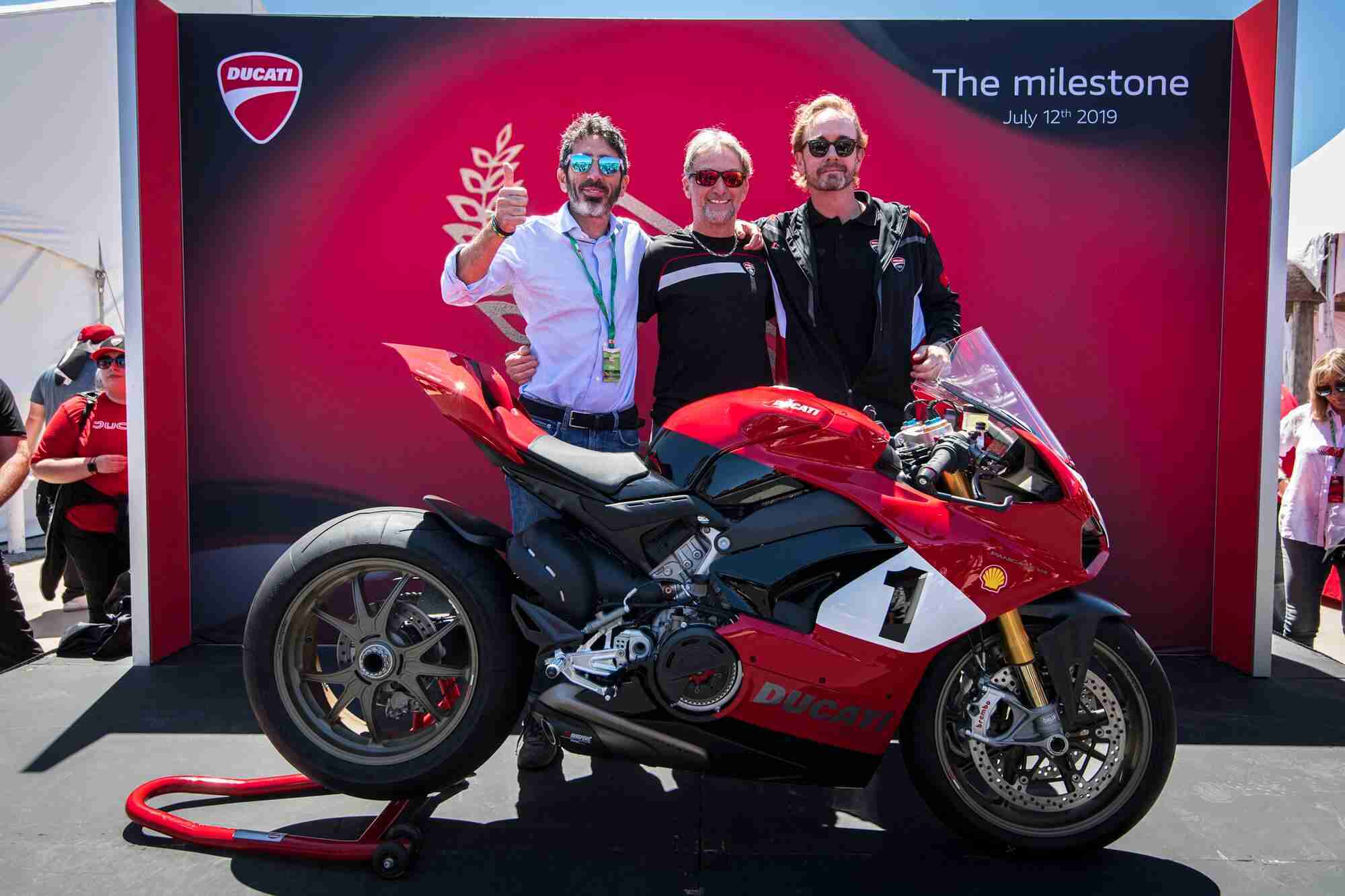 For its world-first preview, Ducati chose round nine of the Superbike World Championship, taking place this weekend at Laguna Seca (California, USA). Here, Francesco Milicia (VP Global Sales & After Sales Director Ducati Motor Holding), Jason Chinnock (CEO Ducati North America) and Carl Fogarty unveiled the Panigale V4 25° Anniversario 916.