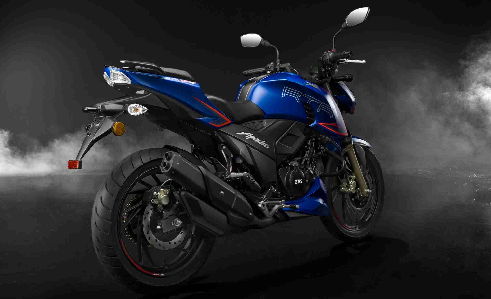 The new TVS Apache RTR 200 4V motorcycle with dual-channel ABS will be available starting today in three colours namely, Gloss Black, Pearl White and the newly launched Matte Blue, inspired by the TVS One Make Championship race bike, and is priced at Rs 1,31,050 (ex-showroom Delhi).