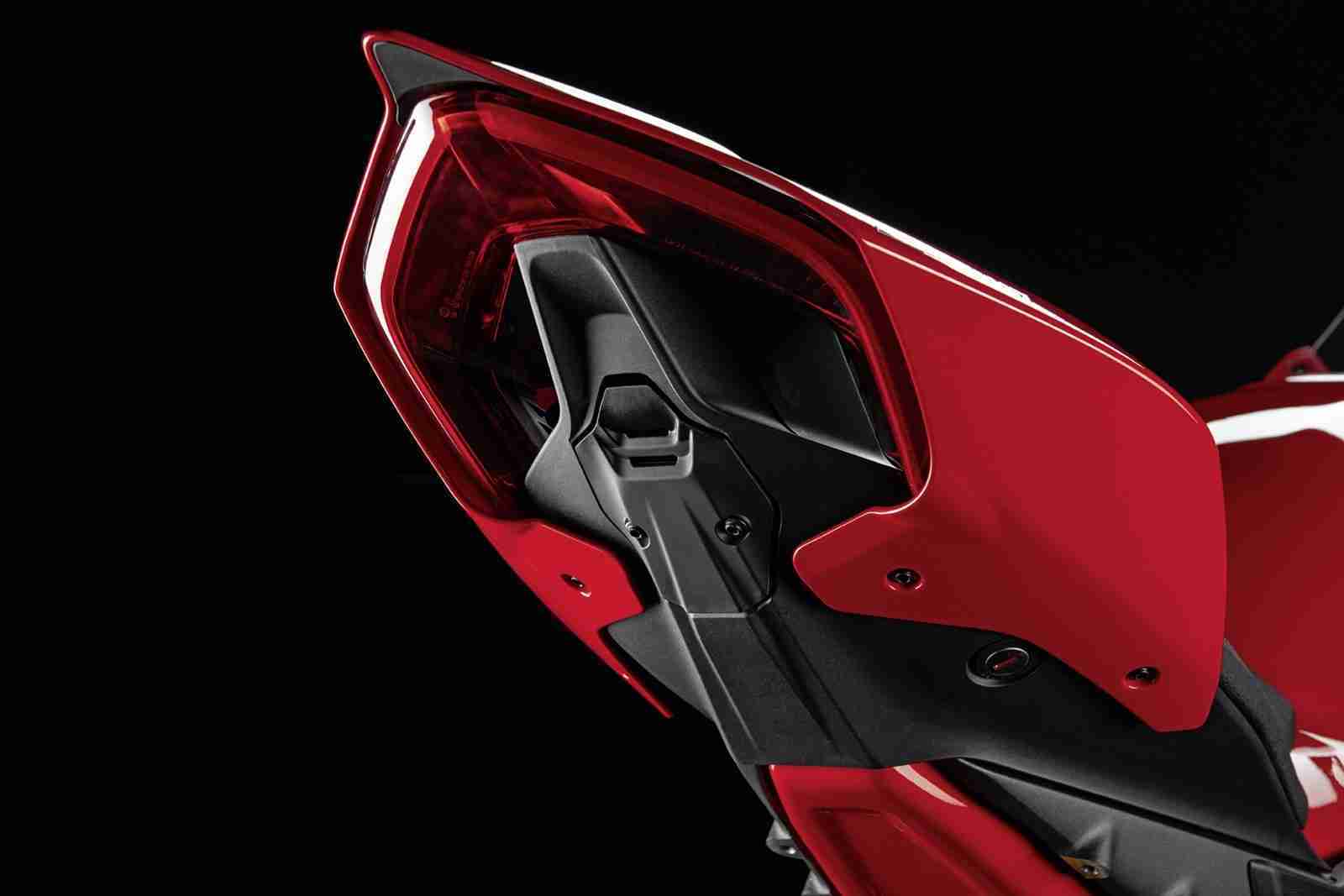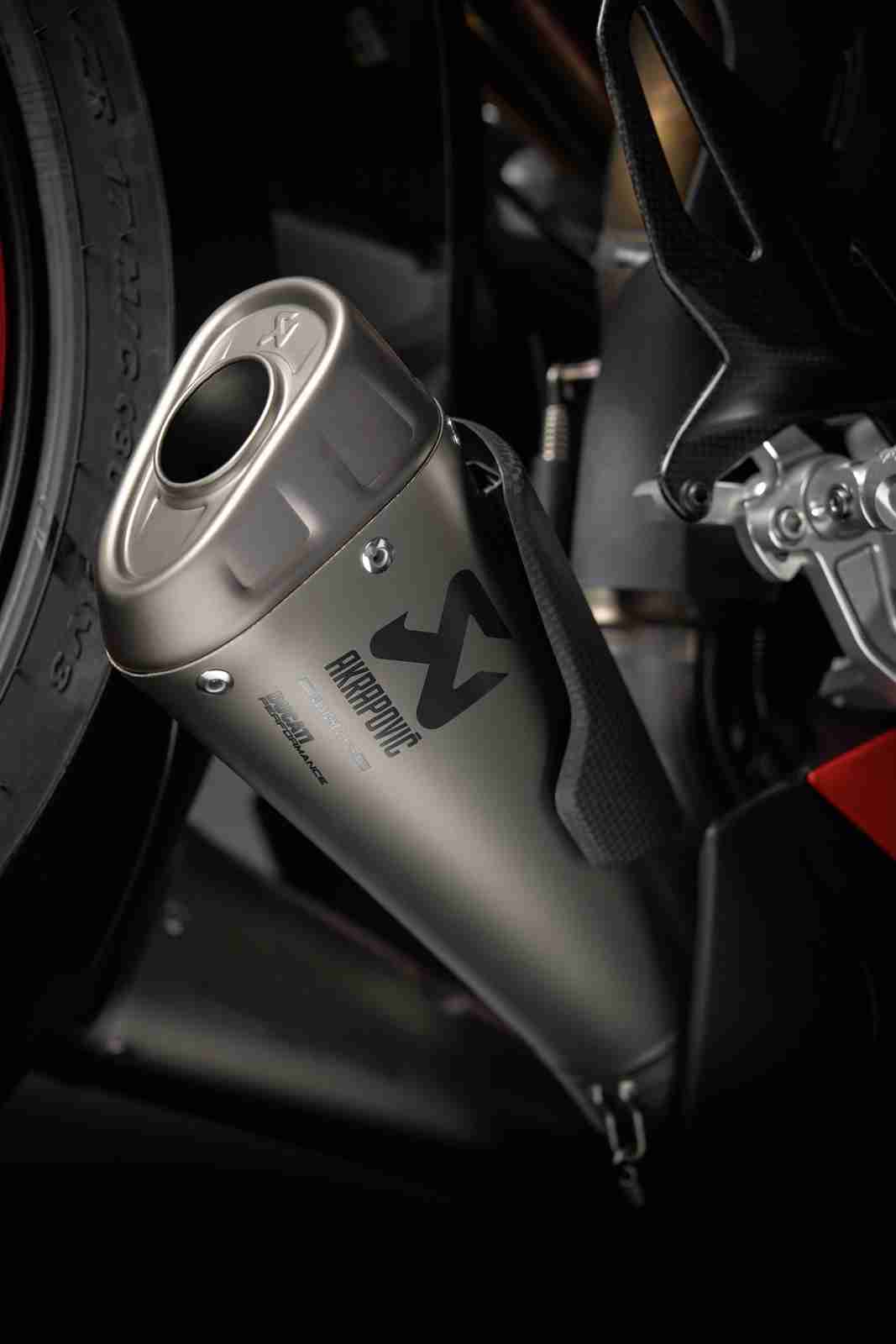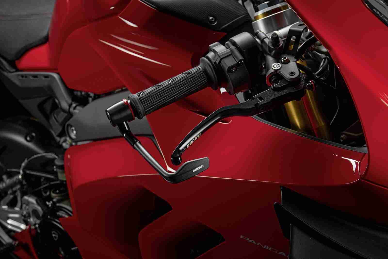 The Racing accessories package for the Panigale V4 offers: Complete exhaust system, lower and upper racing fairings, oversized headlight fairing, swingarm cover, carbon protection for generator cover, mirror hole covers, license plate holder removal set, frame cover set, carbon chain guard, brake lever protection, brake lever protection adapter, side stickers for tank.