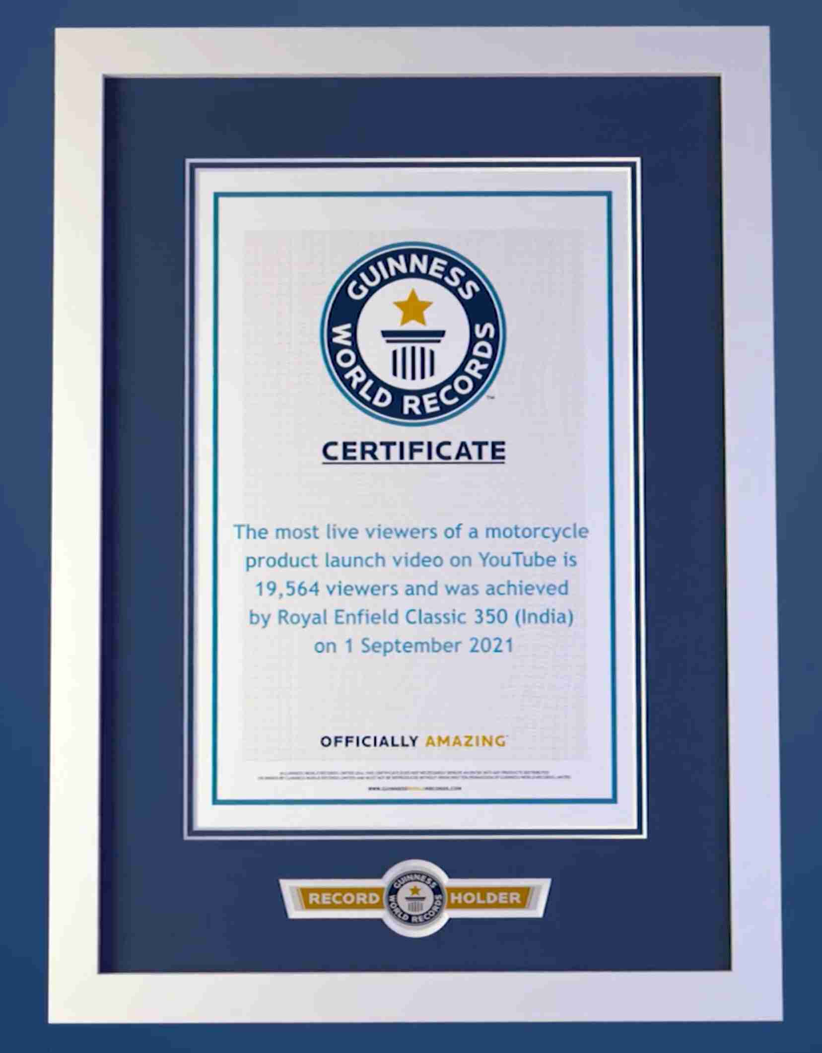 Royal Enfield has made its way into the Guinness World Records history for having the highest live viewership during the launch broadcast of the all-new Classic 350 on YouTube. On 1st September, within a half-hour window, from 11:30 AM to 12 Noon, 19,564 viewers witnessed the launch, beating the existing record standing at 13,779 viewers. While the cumulative viewership of the broadcast ran into lakhs, the concurrent peak viewership has been certified by Guinness World Records as the highest record mark.