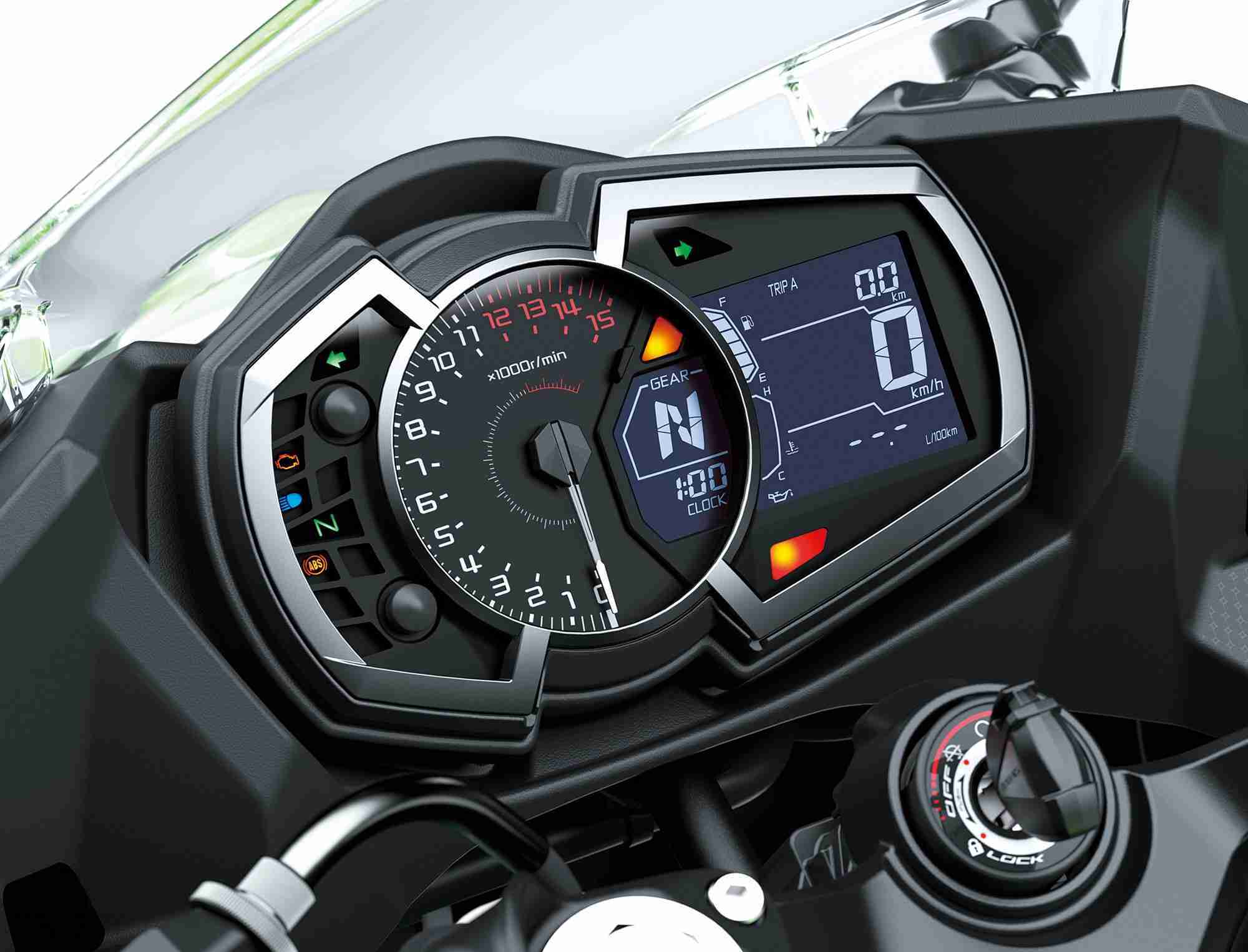 In addition to contributing to the Ninja 400’s sharper looks, slim LED headlamps (each featuring low and high beams, as well as a LED position lamp) are highly visible and offer significantly increased brightness. The new Ninja 400 surprisingly but understandably is equipped with the same instrument cluster as the Ninja 650, contributing to the high grade feel of the tidy cockpit.