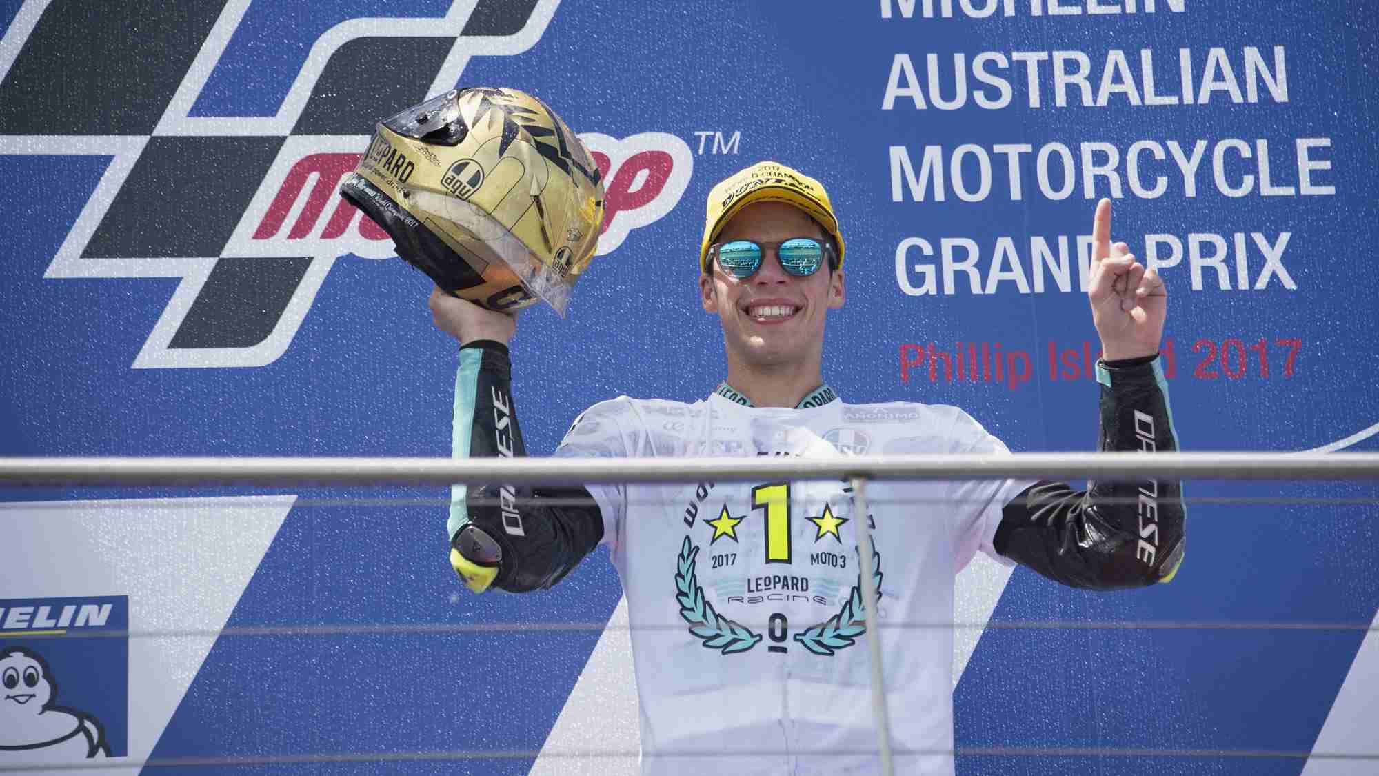 Mir debuted in the World Championship in 2015, at the Australian GP in the Moto3 class, and raced in the same class for the 2016 and 2017 seasons. Despite being a learning year for him, in 2016 he managed three podiums with a first, a second and a third place, but most importantly he got the necessary confidence to be absolutely fit and ready the next year to fight for the title. And he did, indeed, succeed: ten victories, two second places and one third place for a total of 13 podiums (with 1 pole position) gave him 341 points and the crown of 2017 Moto3 World Champion.