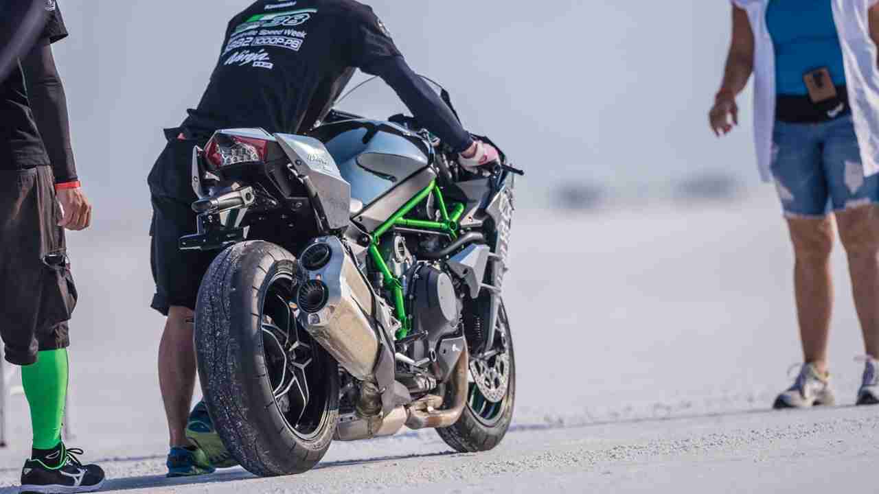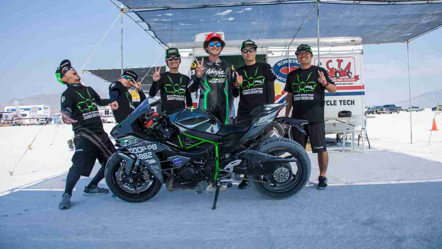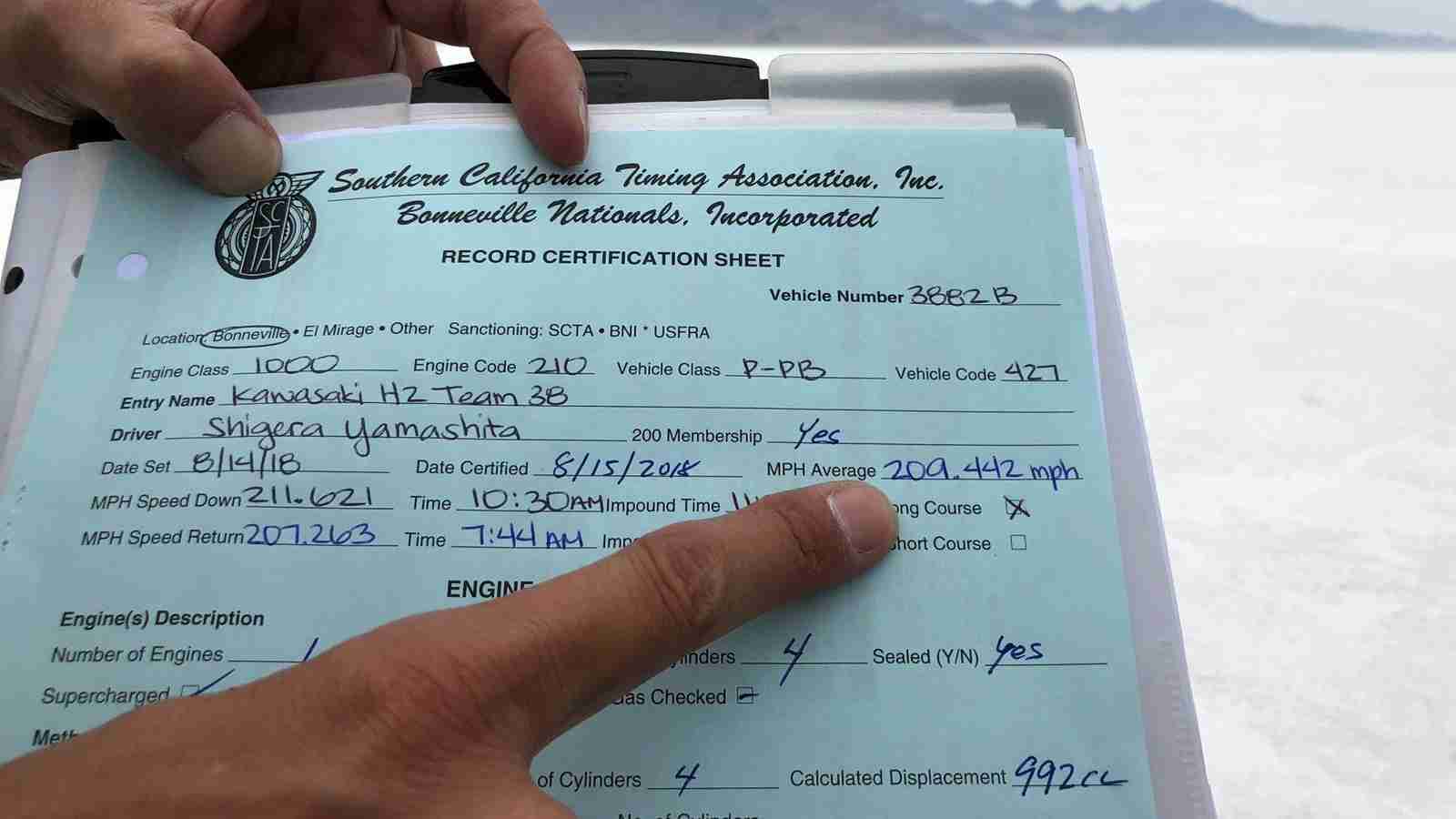 On August 14, the Ninja H2 prepared by Team 38 clocked a speed of 211.621 mph (340.571 km/h). This was followed on August 15 by a return run of 207.263 mph (333.557 km/h). The average speed of the two runs 209.442 mph (337.064 km/h) was recognised as a world speed record in its class, illustrating the considerable performance of the Ninja H2.