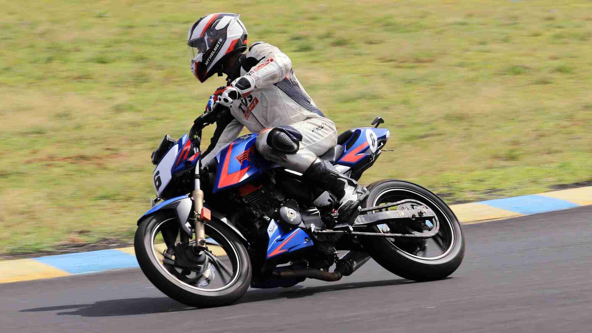 I rode TVS’s flagship naked 200cc RTR, this machine holds its own in the stock form, but for the race, the bike was slightly spruced up with high-lift race cams, a loud free flow exhaust, slipper clutch to reduce rear chatter and some good sticky Pirellis for better grip.