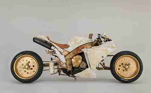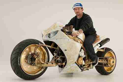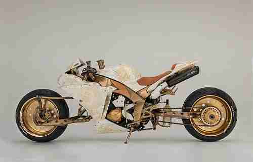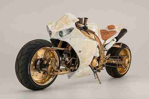 This Yamaha R1 has its front suspension replaced by a single-sided, hub-centre steered front end, radically stretched and fitted with a 240-section tire to match the rear. The system is a full working one too, a point which the makers proved by riding the bike in from its build garage. The copper toned paint job is a tribute to Yamaha’a musical history, and the original company logo is also incorporated on the body.