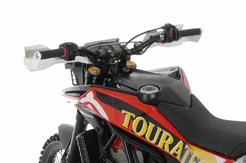 The standard Husqvarna Nuda 900R is a not-so-civilized street bike launched near the end of 2011 and equipped with a 898 cc parallel-twin delivering 100 hp and 100 Nm of peak torque. In order to create this special Nuda X-Cross, Touratech has modified the chassis of the standard 900R, replaced the wheels with proper knobbly ones, added heavy duty suspensions, plonked in a new sports exhaust and of-course all those bits such as engine and radiator guards, hand protectors, sports bike foot pegs as well as optimized suspension components (quite obviously provided by Touratech itself) that would be required to compete in the tough enduro race.