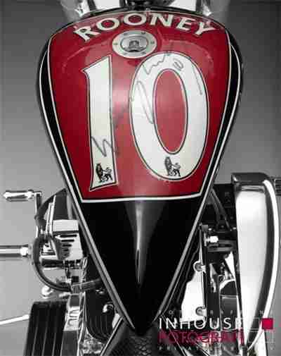Lauge Jensen has made a custom cruiser with a Wayne Rooney theme that has gone up for auction on Ebay. The motorcycle built taking design suggestions from Rooney himself also has his club jersey under multiple layers of lacquer on the tank along with his number. The custom cruiser also has a Wayne Rooney autograph as a final touch of customization. Another interesting design element is the embedded one white and 21 black diamonds on the motorcycle.