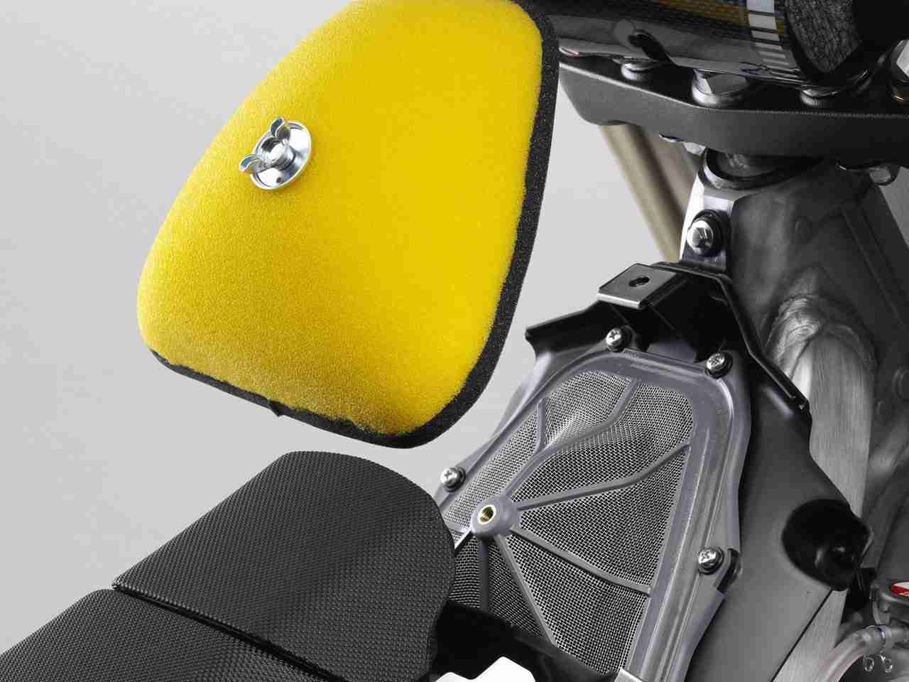 - A new layout for the fuel tank and air cleaner box gives the machine a slimmer feeling between the legs as well as positions fuel tank mass closer to the center of the bike which improves handling feel. Furthermore, the air box can now be accessed without removing the fuel tank for easy serviceability of the new larger air cleaner element.