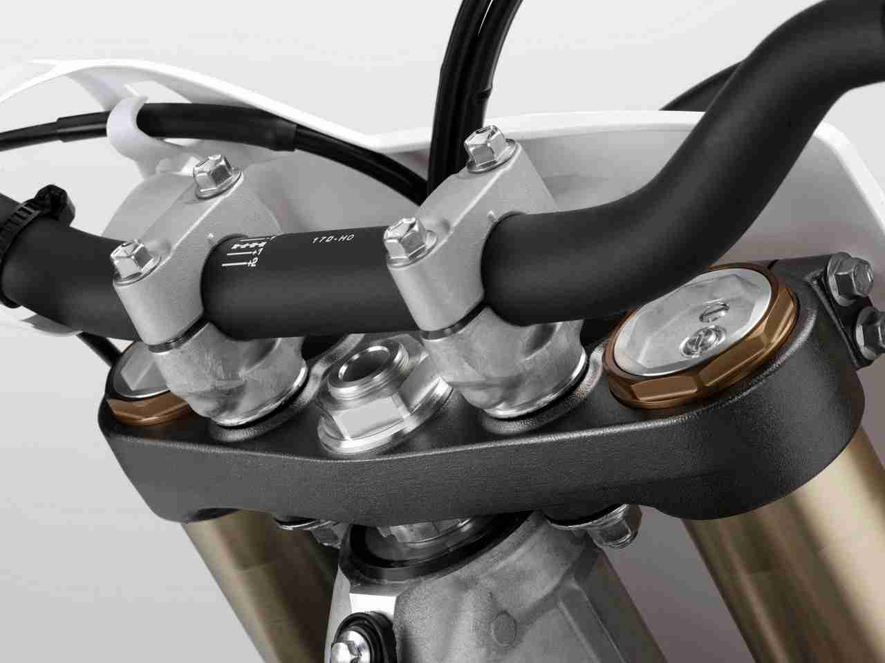 - The new larger diameter 22mm front axle and new top triple clamp increase rigidity for improved handling and front end feel. The handlebar mounts are now rubber mounted to improve comfort and reduce handlebar vibration.