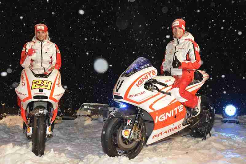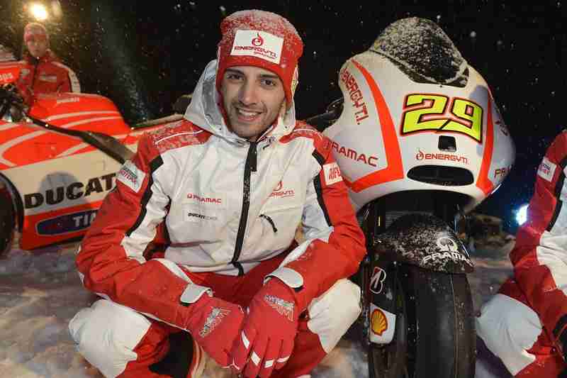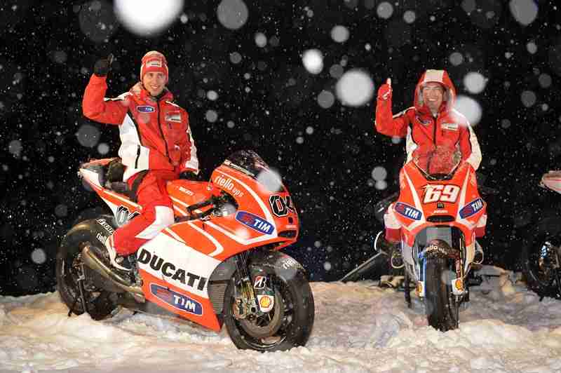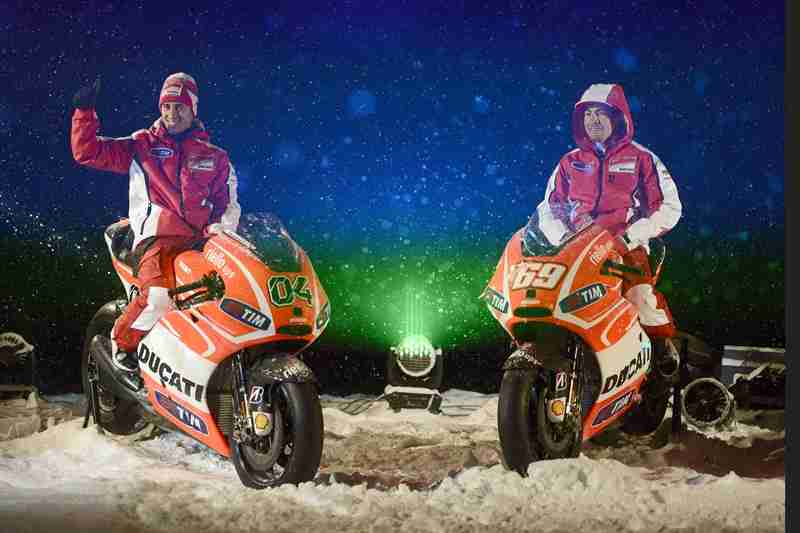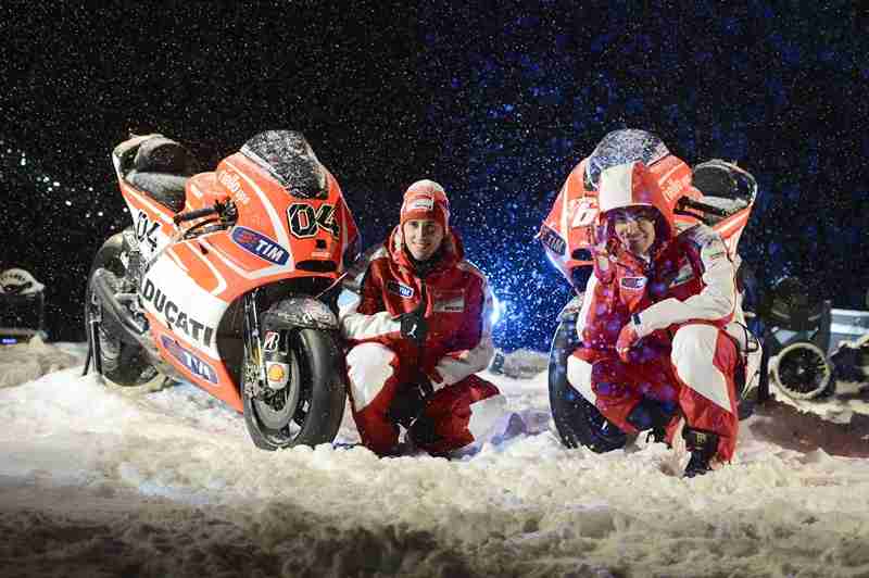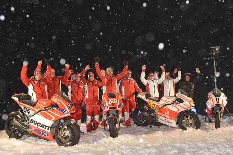 On Tuesday evening the Ducati Team riders Andrea Dovizioso and Nicky Hayden, and their Pramac Racing Team counterparts Andrea Iannone and Ben Spies, together with the management, braved snow-storms, sub-zero temperatures and an altitude of 2200 metres to take the wraps off the bikes that will compete in the 2013 MotoGP World Championship. The splendid evening came to an end with a traditional torch ski run down the mountain, involving riders, media and staff.