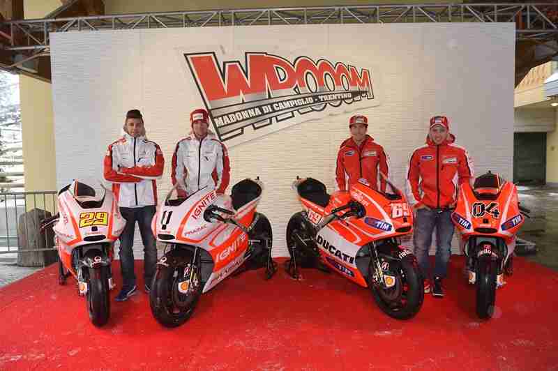 Following on from last night’s spectacular unveiling of four Ducati Desmosedici GP13 machines at the Pradalago Chalet in the mountains above Madonna di Campiglio, the 23rd edition of the Wrooom F1 & MotoGP Press Ski Meeting came back down to earth today on the third day of the event held in the Trentino Dolomites.