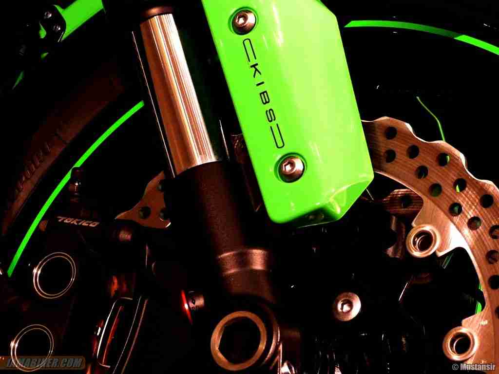 The ZX10R is packed with special features as well namely the S-KTRC, Power modes and the KIBS. The Sport- Kawasaki Traction Control (S-KTRC) allows power slides and power lifts as long as effective traction is maintained. The rider can choose between 3 modes depending on the riding surface and can also choose to turn the assist off completely. The mode selection will also be memorized after the vehicle has been turned off thus preventing frequent adjustments. The 3 stage power mode selector enables the pilot to choose between full (100%), middle mode value (75%) and low (50 to 60%) power with a reducing curve. The Kawasaki Intelligent Anti-lock Braking System or KIBS is a high precision aid that takes feedback from clutch, gear, throttle position, engine speed along with the hydraulic pressure in the front brake. This suppresses rear wheel lifting and improves feedback and allows the rider to push the bike to the very limit with confidence.