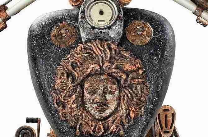 The chassis and body shell of the motorcycle which has 6 speed gearbox are made of white and yellow gold. With a theme revolving around the mythological Medusa, the gold motorcycle has her face placed on its fuel tank, accompanying these are snake figures on its chassis and fender. Telli said that it had taken him more than one year to build this motorcycle and he plans to put it up for auction soon.