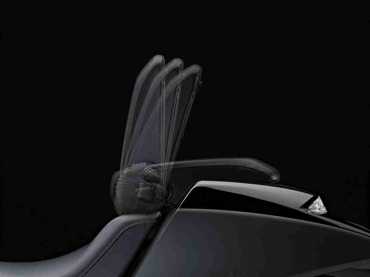 The obvious question every NM4 Vultus rider will face is “what film was THAT in?”. Its looks are that bold. And as a machine that comes straight from the rapidly beating heart of Japanese manga culture, it was always going to be different. Having absorbed its striking presence, the thought that’s gone into the design becomes more apparent. Storage spaces abound, concealed in the front bodywork. The lockable left compartment opens with the ignition key and features 1-litre of storage space plus a 12V DC adaptor to recharge what matters while on the move. The right compartment has 3-litres of storage and opens with a push of a recessed, triangulated button. Optional rear panniers integrate fluidly adding even more convenient carrying capacity. And in one of those “how come this hasn’t been done before?” moments, the rear pillion seat flips upright when not in use, locking to provide the rider with a secure backrest and almost fighter pilot riding position. Its angle can be adjusted through 3 positions and it slides back/forward 25mm through four settings, to fine-tune cockpit comfort. The digital dash changes mood depending on the drive mode selected, with subtle colour changes from Neutral (white) through D (blue) to S (pink), ultimately to MT (red). Alternatively, the rider can choose one colour from five other tonal ranges of colour — 25 individual colours altogether — they want to live with on a day-to-day basis.