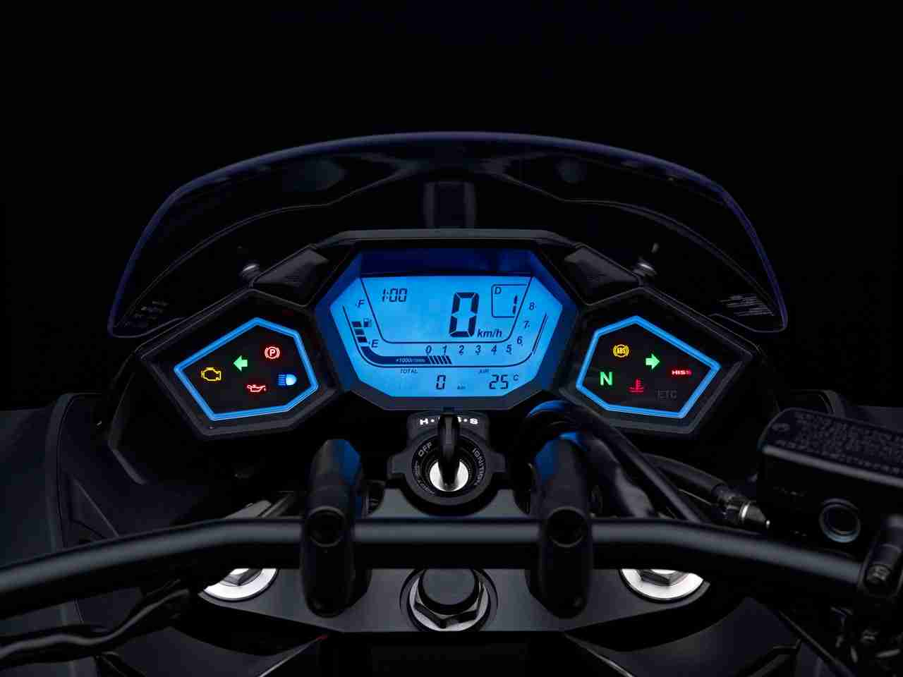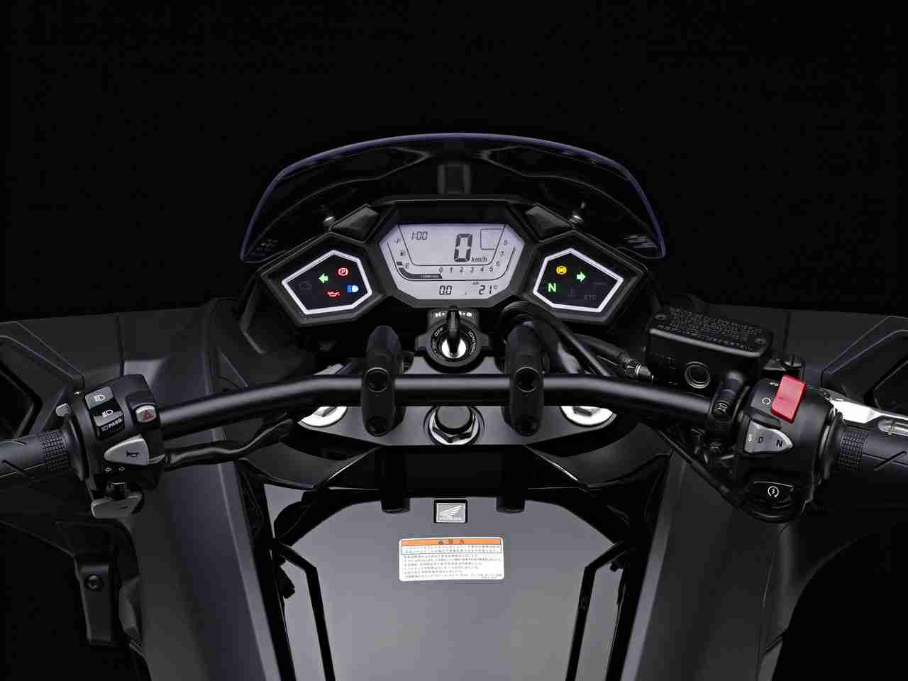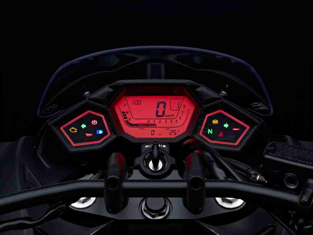 - Digital speedometer, digital bar-type tachometer, clock, bar-type fuel meter, two trip meters, gear position indicator, outside air temperature gauge and coolant temperature warning lights.