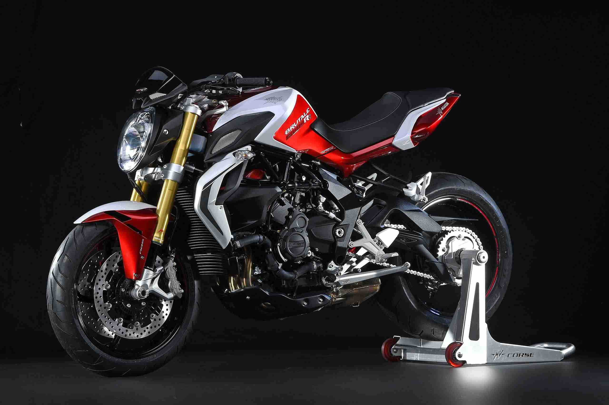 Faithfulness to the original lines shows just how relevant the Brutale project is today: the compact, smoothly integrated volumes, the perfect proportions, the attention to the tiniest details and consistency with renowned MV Agusta brand styling make this naked an unsurpassed example of Italian creativity. Some features make the Brutale 800 RR instantly recognisable from an aesthetic viewpoint too, such as the red-painted cylinder head which contrasts beautifully with the solid black of the compact, in-line three cylinder engine. Or the new finish of the Marzocchi fork, which has also benefited from functional upgrades, and now sports an “aged gold” colour. The look and shape of the seat have been changed to improve comfort and ergonomics for both rider and passenger while the eye-catching stitching emphasises the attention to detail that is so fundamental to MV Agusta corporate culture. The LED tail light has a brand new diffusion system that suffuses the light evenly, achieving the dual goal of enhanced bike visibility – and, consequently, improved passive safety – and even better rear-end styling. The wheels, made of cast aluminium alloy, now feature a new five-spoke design. The colour schemes are specific: the Rosso Shock Perlato/Bianco Ice Perlato (Pearl Shock Red/Pearl Ice White) combination is reminiscent of traditional MV Agusta colours, while the elegant Grigio Avio Metallizzato/Nero Carbonio Metallizzato (Metallic Aviation Grey/Metallic Carbon Black) provides an alternative for those with ‘darker’ tastes. The graphics are consistent with those of the Brutale family but in this case they highlight the fact that this model belongs to the exclusive RR group (i.e. the flagship versions of the Italian manufacturer’s models).