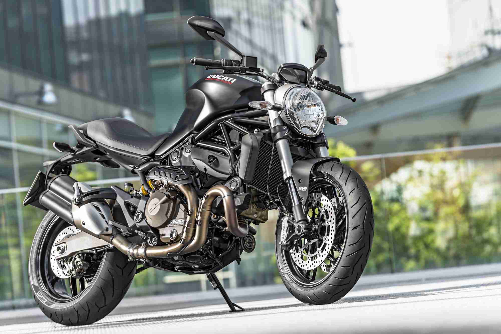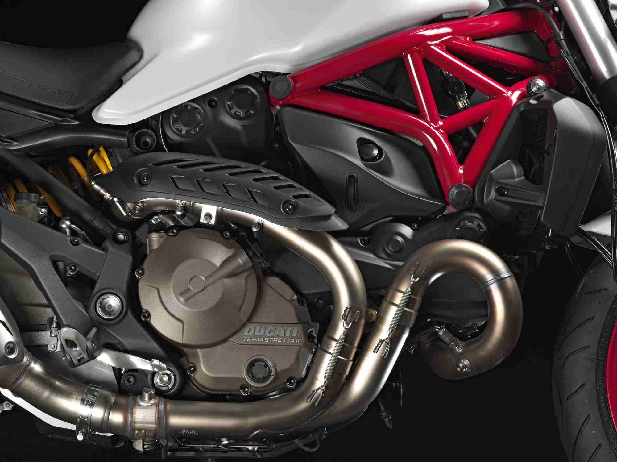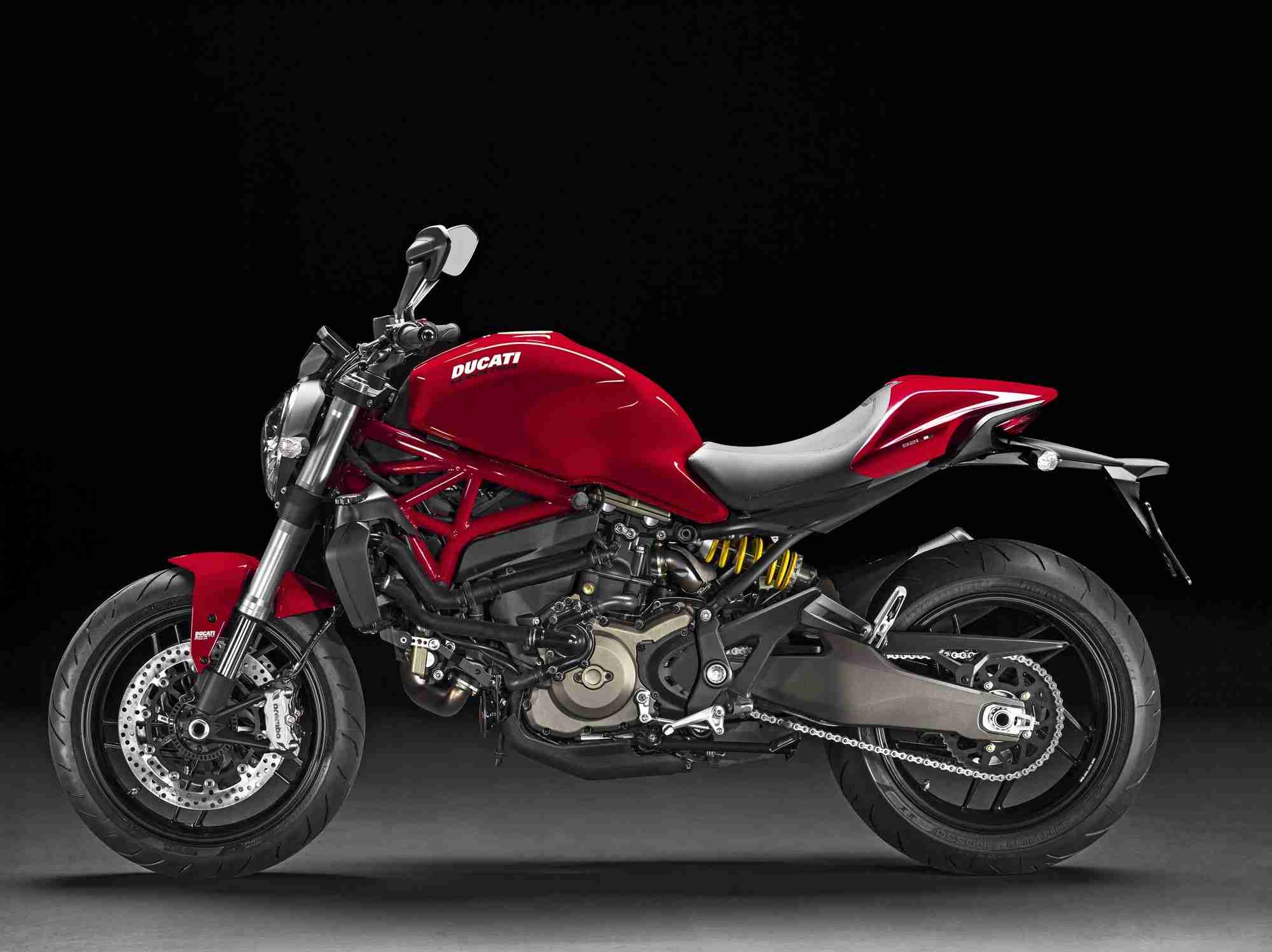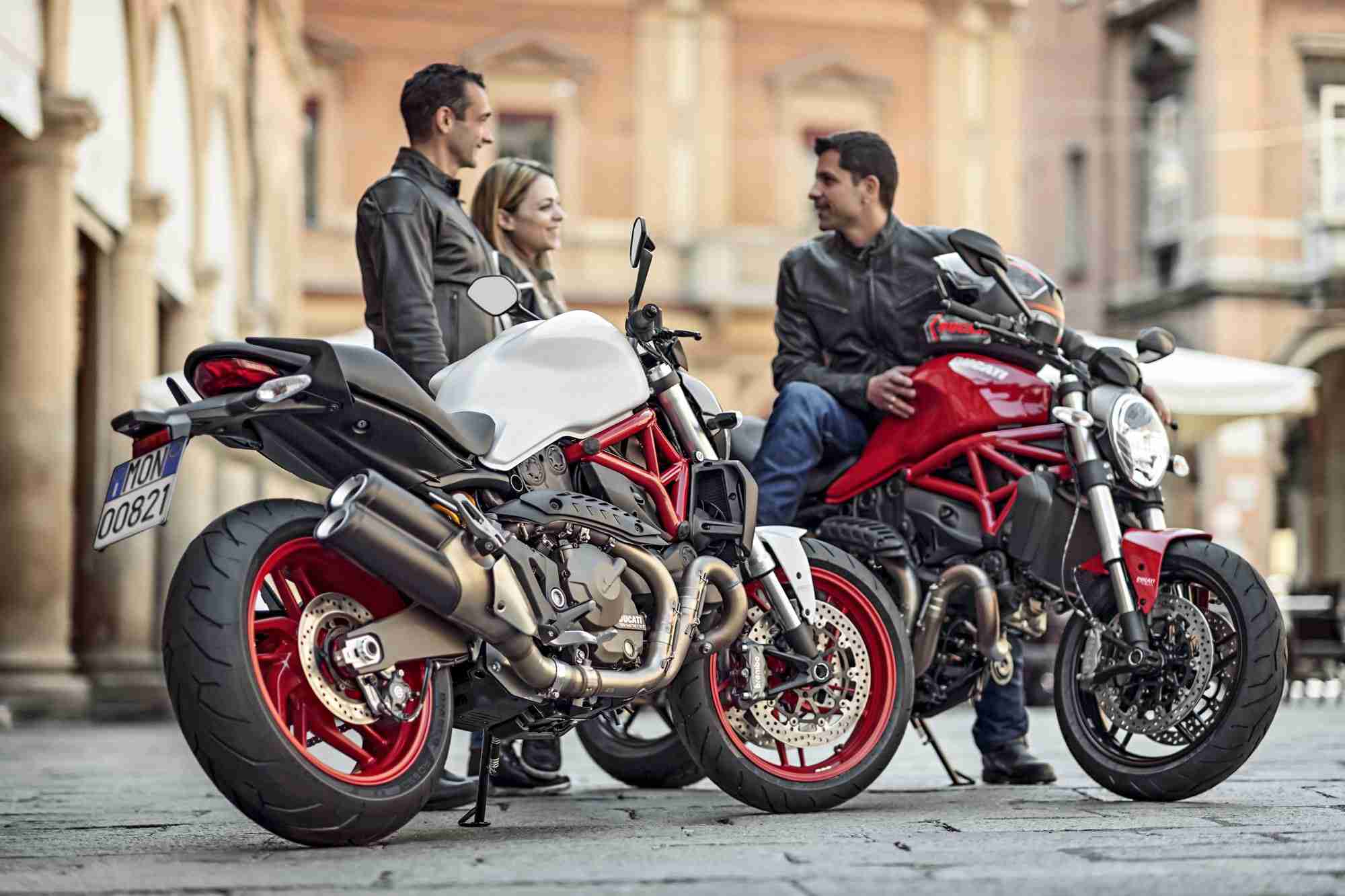 Available in Ducati Dealerships from July 2014 on wards, the Monster 821 Dark is presented in dark stealth with black frame and black wheels, while the Monster 821 is dressed in Ducati red with red frame and black wheels or star white silk with red frame and matte red wheels. Both red and white liveries are equipped with colour-matched single-seat covers. The brand new model is also made available to restricted license holders with the specially regulated power versions of 25kw for Switzerland and 35kw for other participating countries.