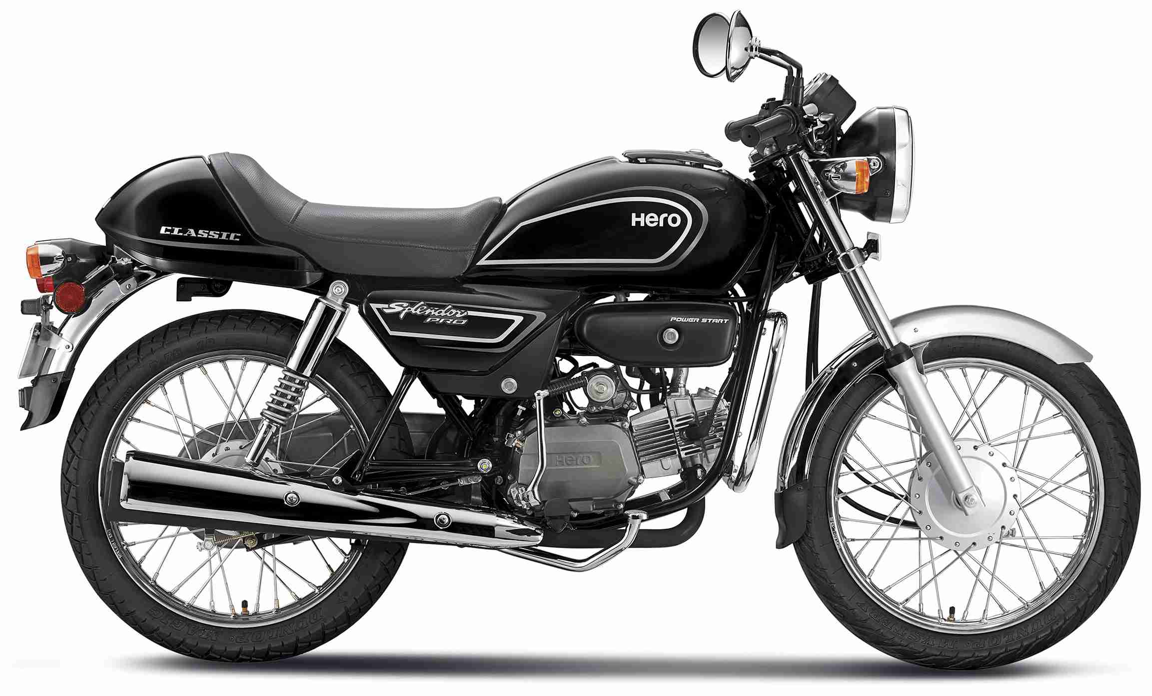 The Splendor Pro Classic comes with an air-cooled 4 Stroke Single Cylinder OHC engine that delivers maximum power of 6.15 kW (8.36 Ps) @ 8000 RPM and maximum torque of 0.82 Kg-m (8.05 N-M) @ 5000 RPM. It offers a distinct riding experience with its cafe racer styling, including classic single seat, vintage style café cowl, sporty handle bar, classic round headlight and tail light and classic round speedometer. All this comes with classic chrome parts, such as, the front and rear fenders, winkers, suspension cover and the round shape rear view mirrors. Expected mileage: 60 kmpl