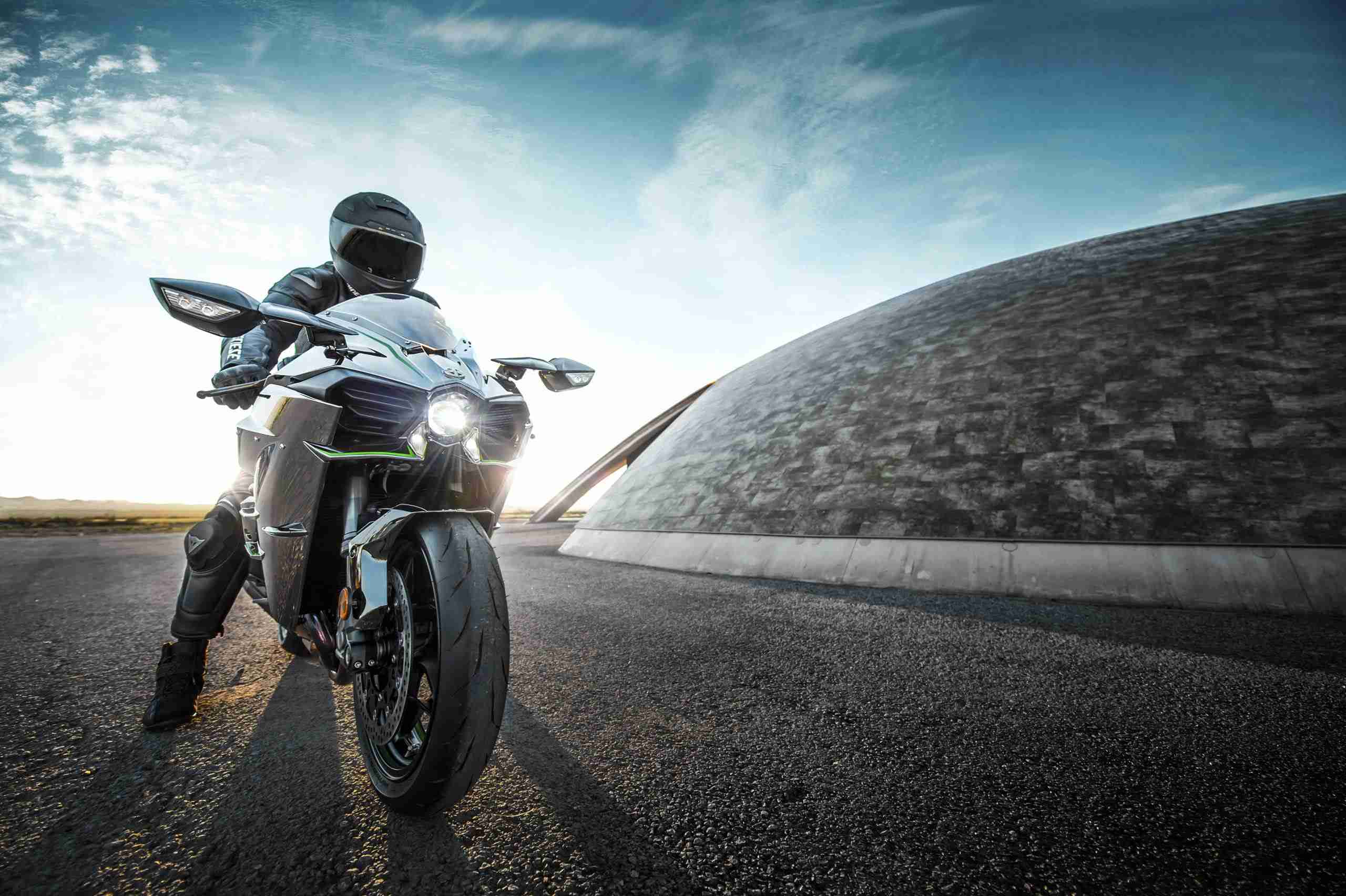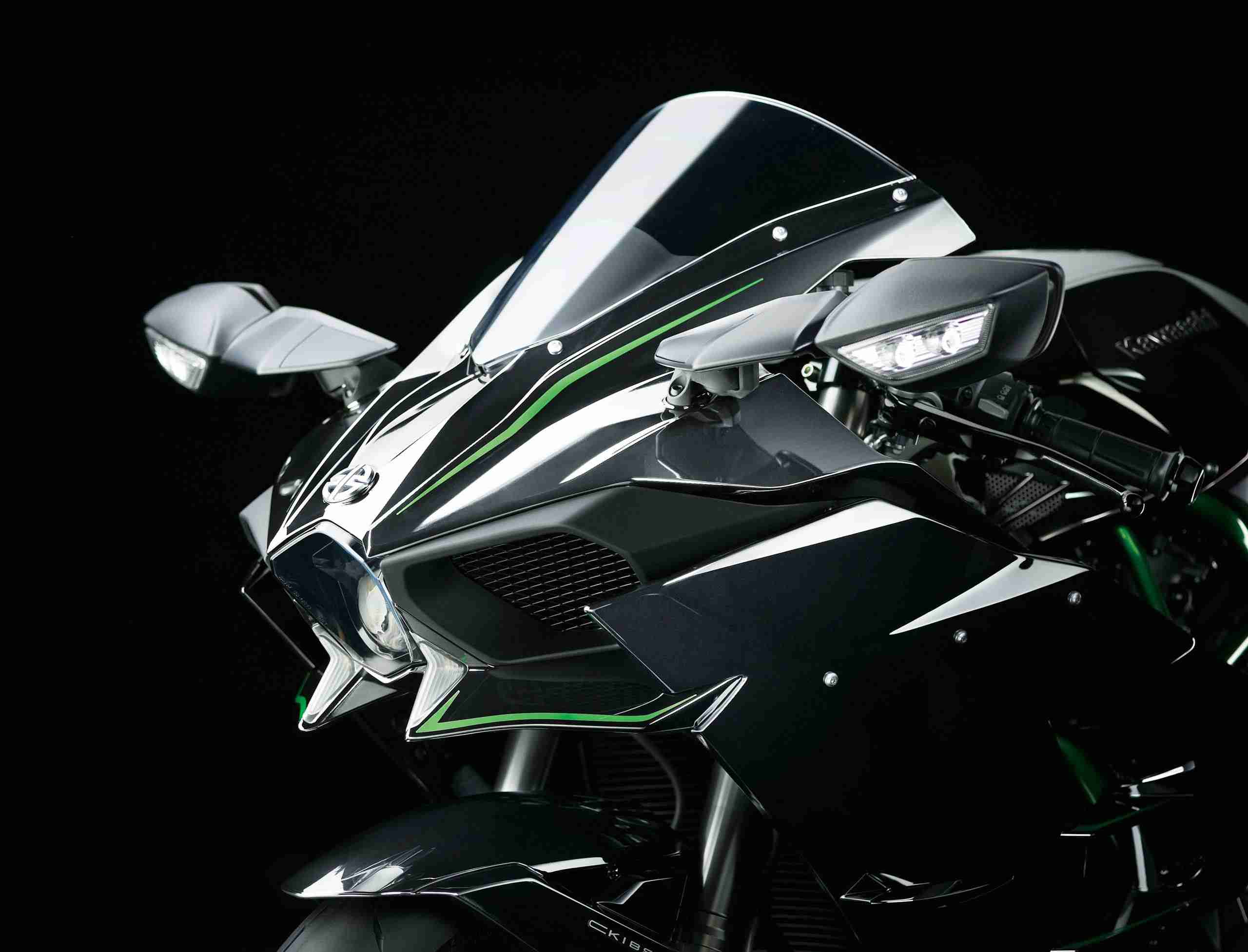 The launching point for the development of the Ninja H2 was a strong desire to offer riders something they had never before experienced. Convinced that a truly extraordinary riding experience would not be found on a motorcycle that merely built on the performance of existing models, the design team committed to developing the “ultimate” motorcycle from a clean slate. The bike needed to deliver intense acceleration and an ultra-high top speed, coupled with supersport-level circuit performance. To realise this goal, help was enlisted from other companies in the Kawasaki Heavy Industries (KHI) Group, precipitating an unprecedented level of inter-company collaboration. Development pursued two paths. The first was a closed-course model (Ninja H2R) that allowed an unadulterated pursuit of performance free of the limitations that street riding would impose. This was followed by a street model (Ninja H2), based closely on the closed-course model, that would meet all market regulations. The results were incredible, with both models offering a sensory experience surpassing anything that riders can find today. The Ninja H2 is powered by a supercharged engine based closely on that developed for the over 300 PS Ninja H2R. High output notwithstanding, the compact design is on par with power units found in supersport litre-class models. The key to achieving this incredible performance lies in the engine’s supercharger—a motorcycle-specific unit designed completely in-house with technology from the Gas Turbine & Machinery Company, Aerospace Company and Corporate Technology Division.KHI Group technology was not limited to the supercharger. Advanced technological know-how shared from other group companies is found throughout the innovative engine and chassis designs. For example, the aerodynamic mirror stays that add stability for high-speed riding were designed with assistance from Kawasaki’s Aerospace Company. This is only one of many examples, but such inter-company collaboration and the level of resultant technology poured into this model is the reason the Kawasaki River Mark is displayed prominently on the upper cowl.