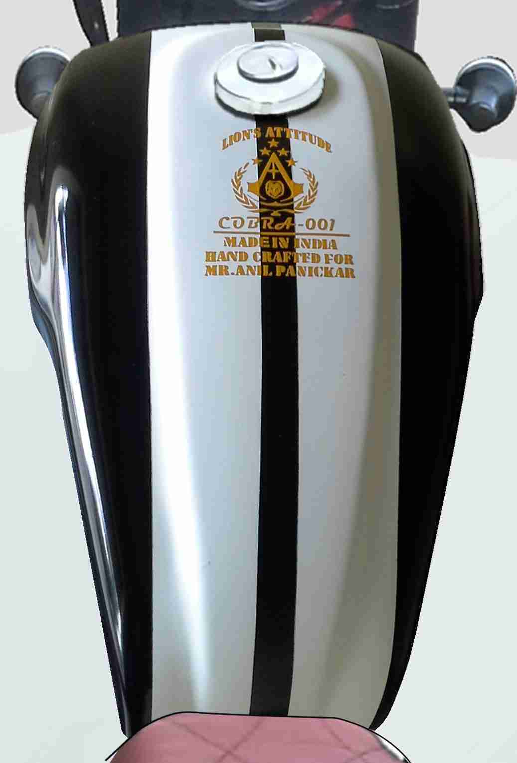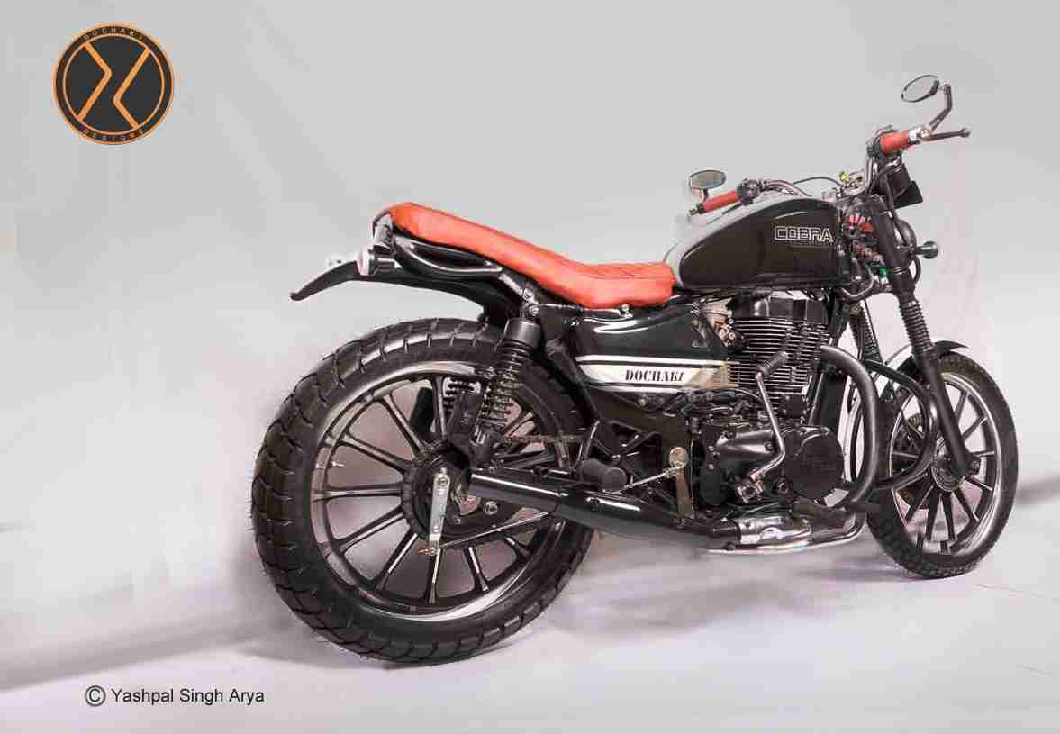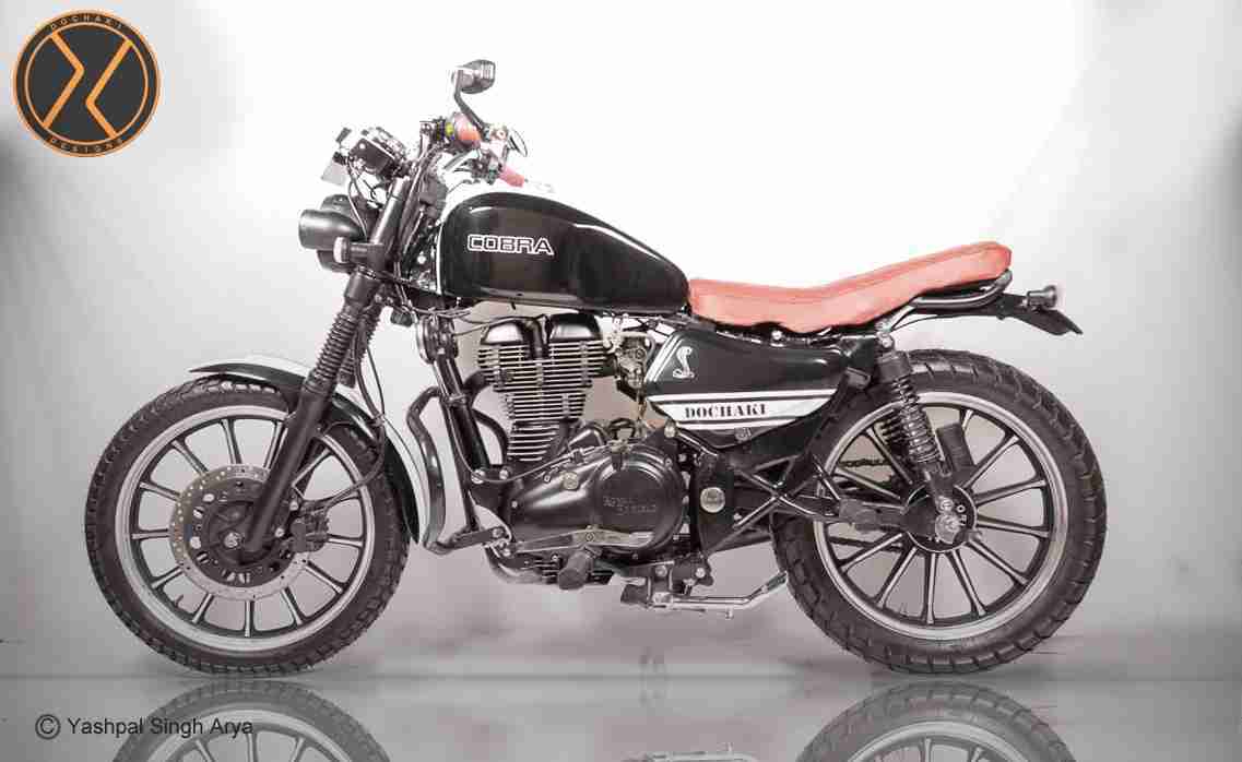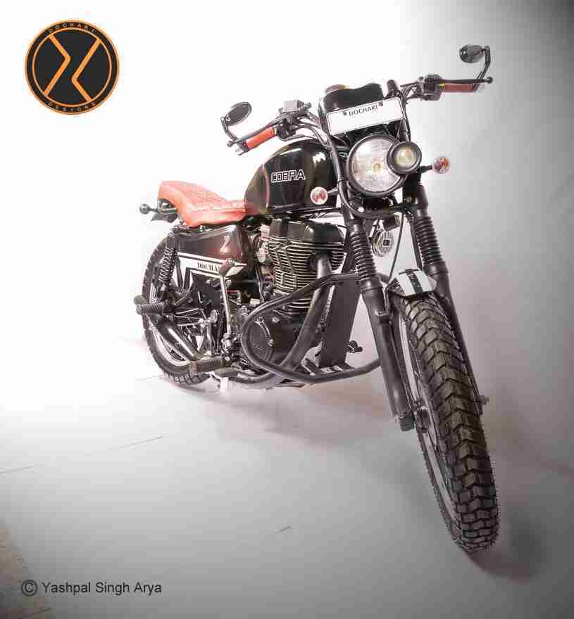 Today we introduce to you, Dochaki Custom Motorcycles, started by Anupam Singh Parihar and their latest build the Cobra. Based on a Royal Enfield Thunderbird 350, the Cobra is a tribute to the iconic Shelby Cobra with a scrambler theme thrown in. The vision for the motorcycle has been simple, create a scrambler that is practical and usable and not one that sits in a garage or the front room. A motorcycle that can handle all the surprises that our roads can provide. Custom paint job and pinstriping apart, the Custom Royal Enfield – Cobra receives, hand crafted body panels, a custom petrol tank, high rear fender, alloy wheels, tubeless tyres and street friendly handlebars. The engine has been tweaked for better power and a smoother overall feel. The dual headlights, LED tail light and a custom instrument console give the finishing touch of adding a bit of the modern world to the overall retro theme. The Custom Royal Enfield – Cobra took over 2 months to build and sure does look good. Looking forward to what these guys come up with in the future.