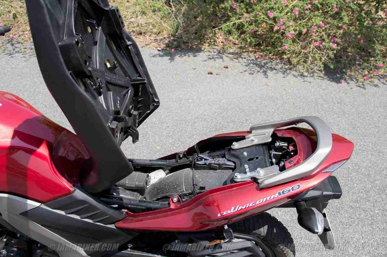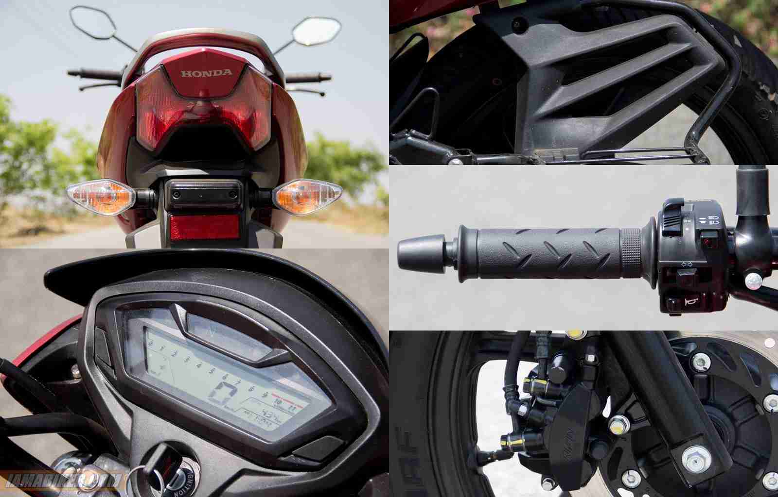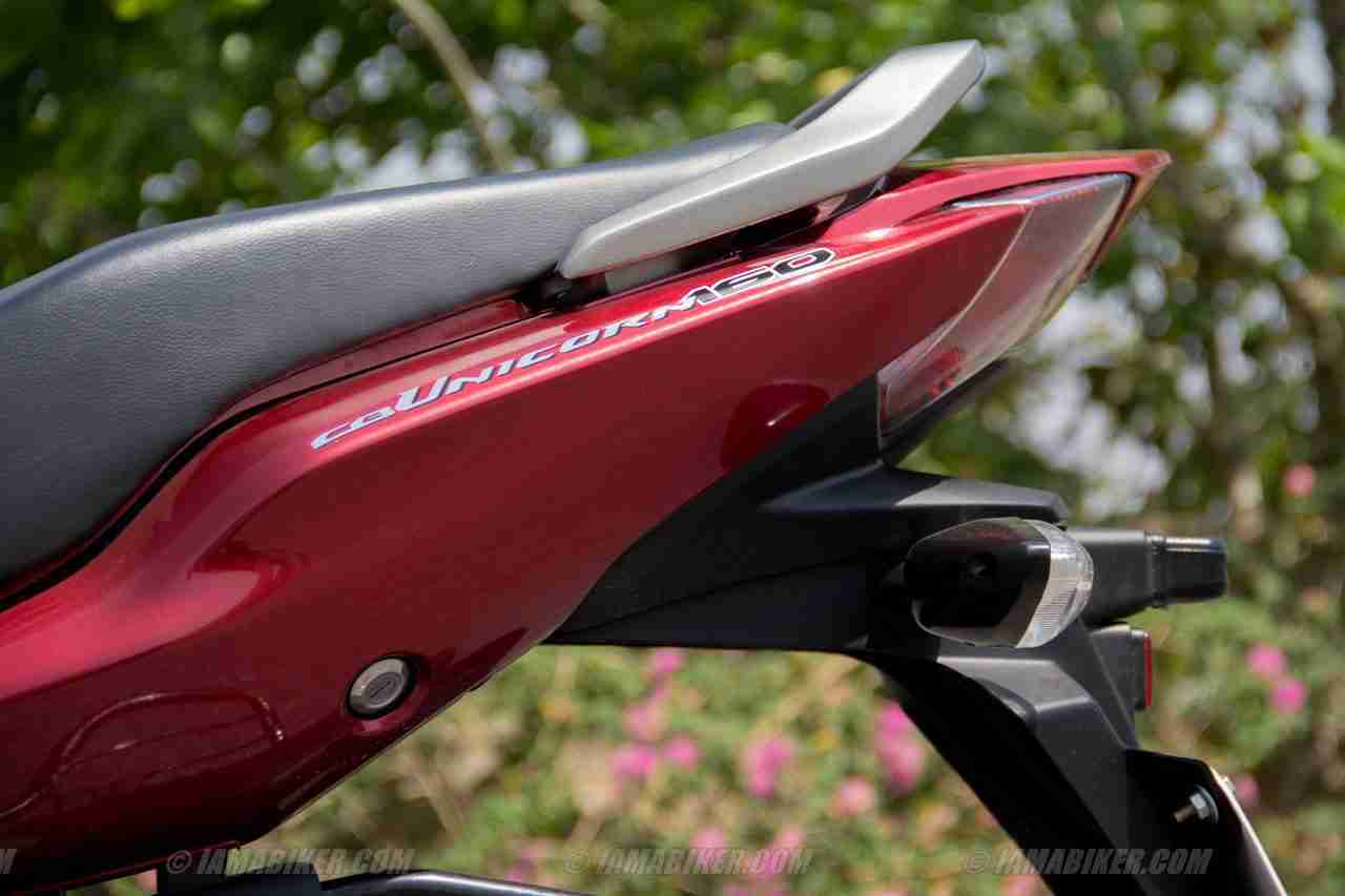 Looks wise the Honda CB Unicorn 160 CBS is not exactly exciting, but at the same time it has a premium and serious mood, a no nonsense look. No unwanted curves and lines, no complicated design thoughts just a streamlined approach from front to back, quite sleek. Mind you the CB Unicorn 160 CBS is not a small bike like its competition. It has a very good presence and quality feel. The ‘H’ shaped LED tail light is quite the attention grabber. The chubby exhaust and the entire bottom half of the bike get the all black treatment and looks good. We must mention how well Honda have integrated the saree guard onto the Honda CB Unicorn 160 CBS, it gels very well with the bike and does not look like an after thought. The build quality is typical Honda, excellent fit and finish everywhere. All panels are lined up properly, no lazy engineering and everything is top notch. The CB Unicorn 160 comes in three colours options, Pearl Igneous Black, Imperial Red Metallic and Geny Gray Metallic.